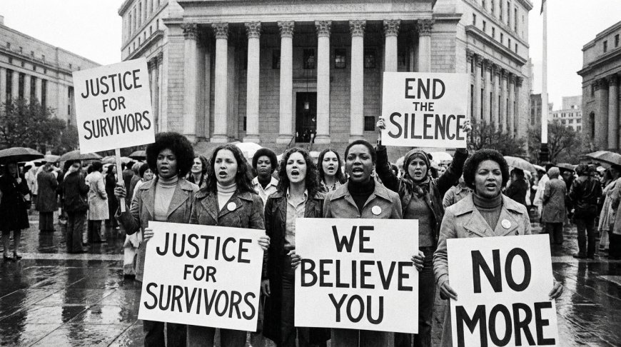 Black and white photograph of a protest calling for justice for Epstein's victims.